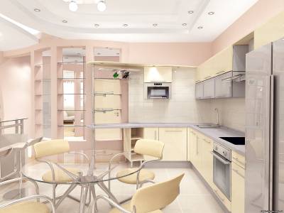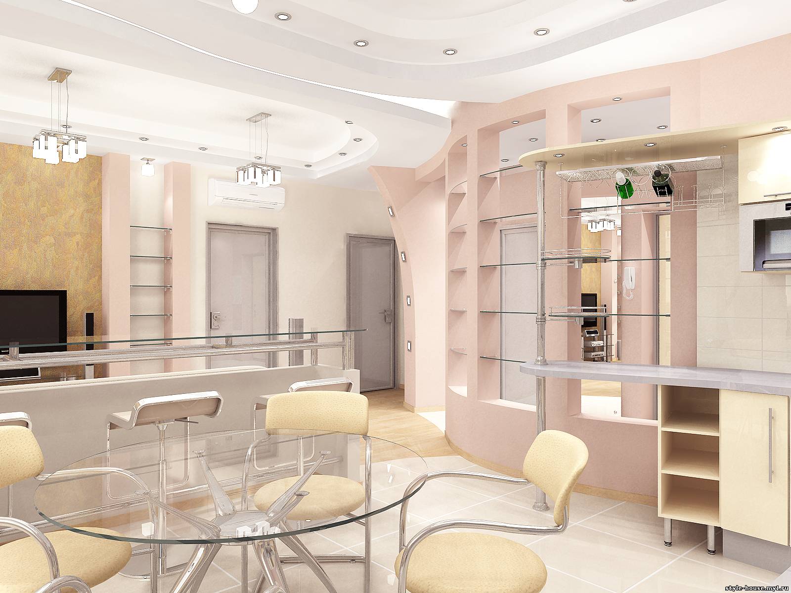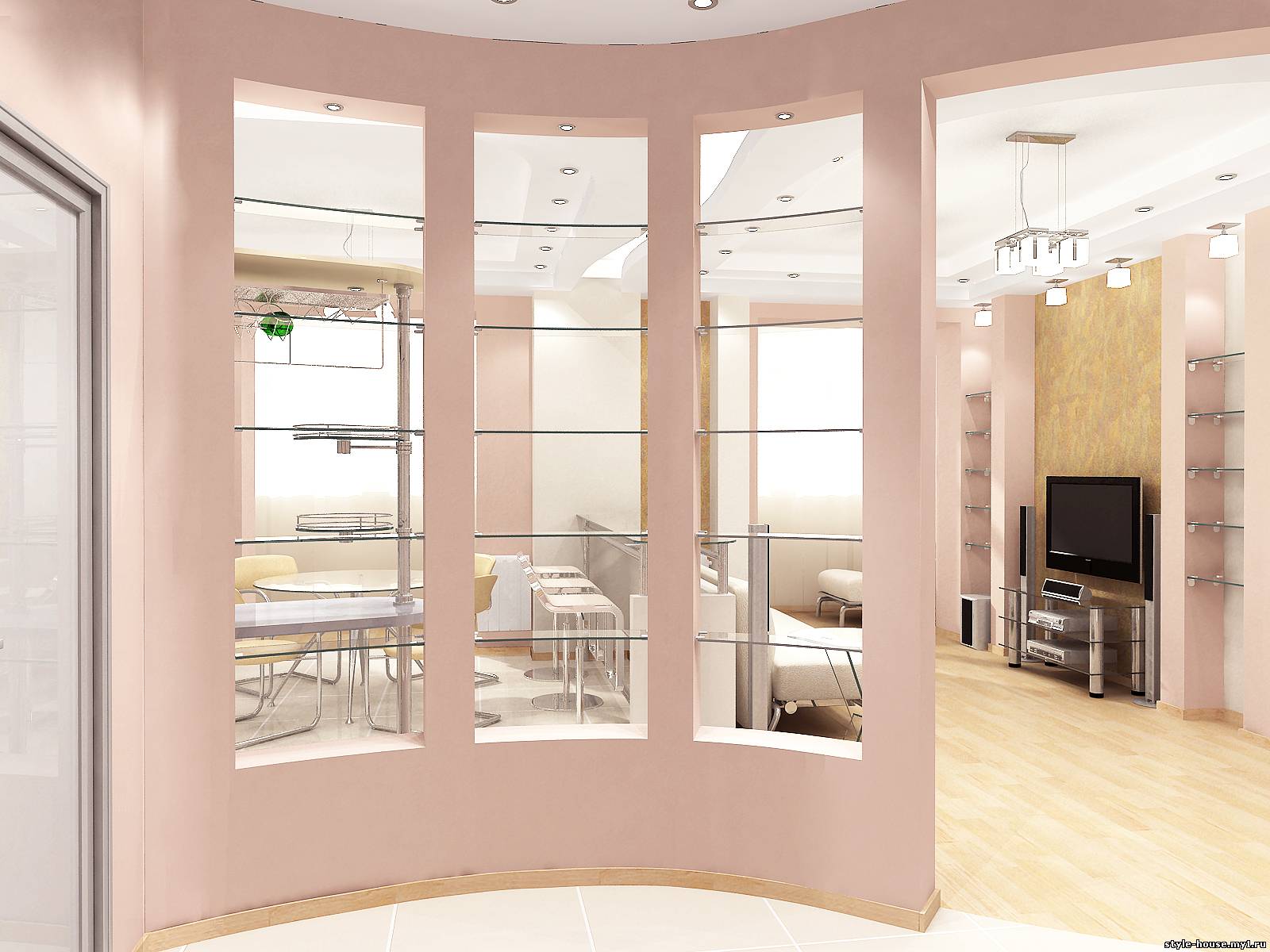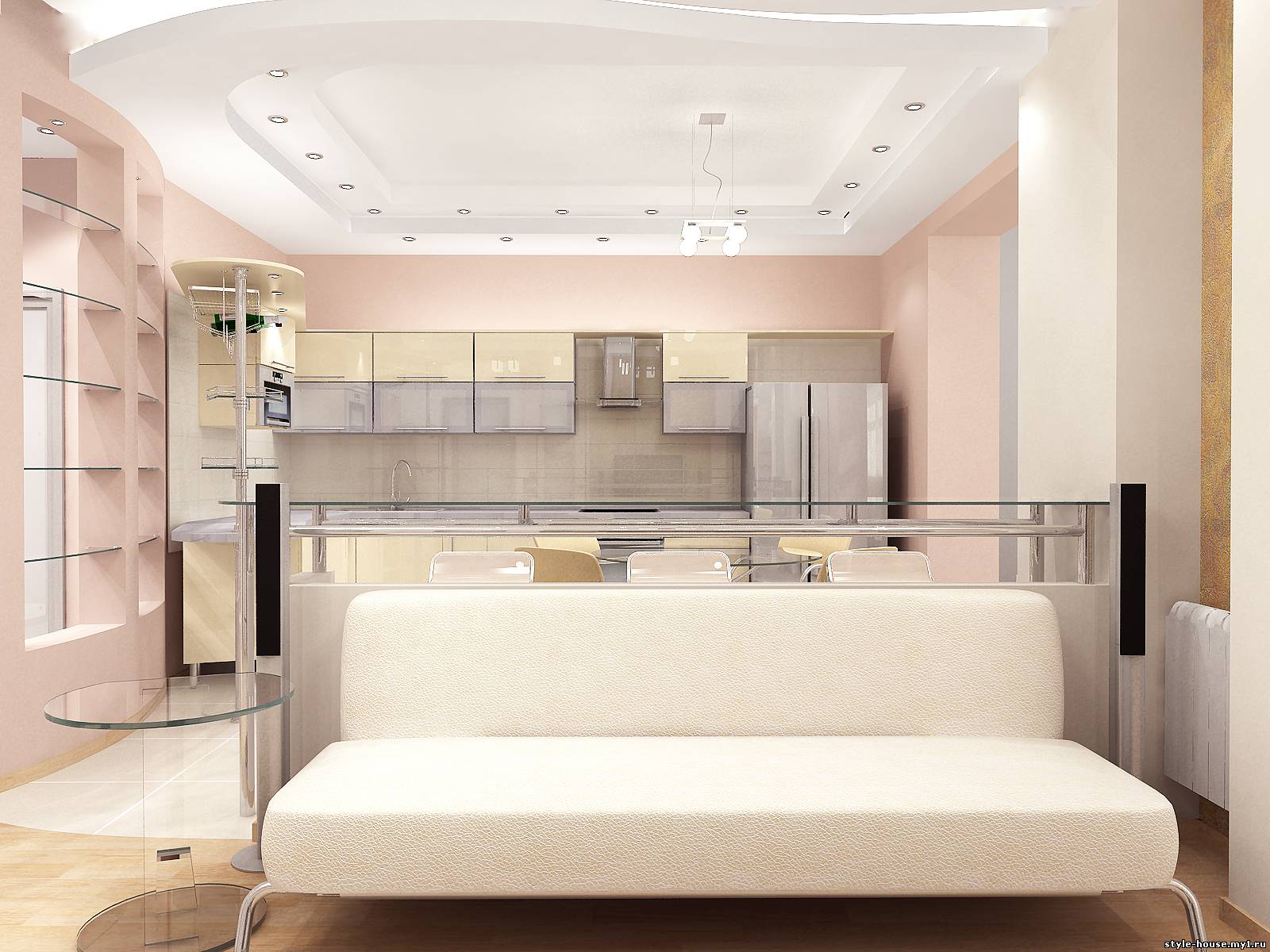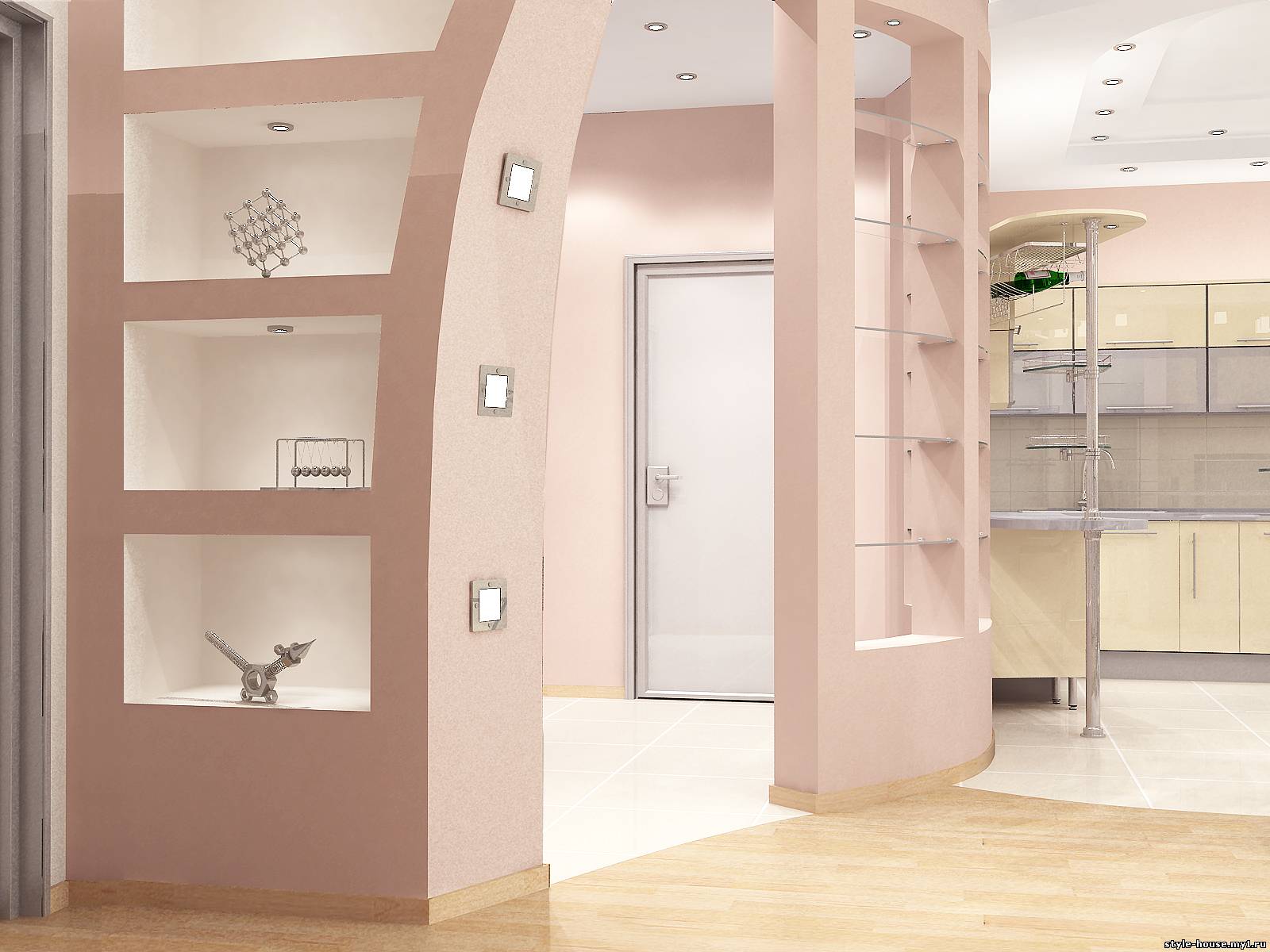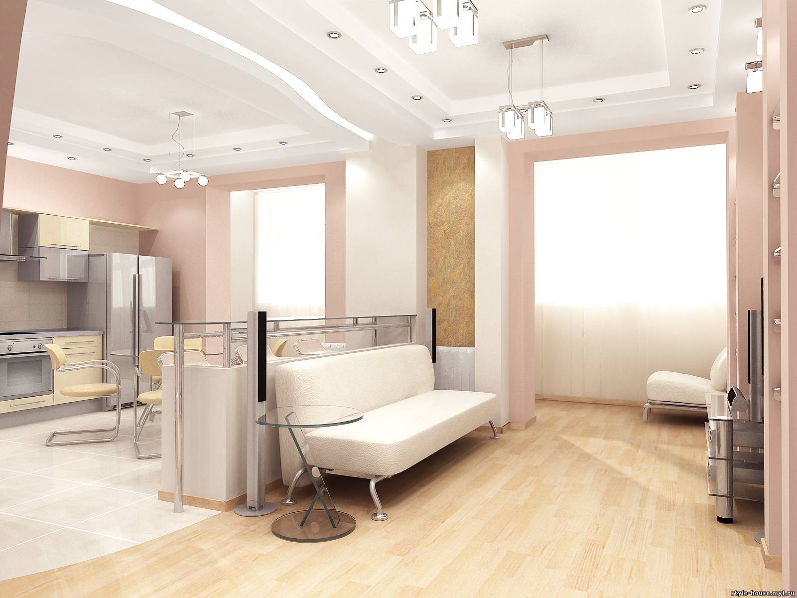ПРИМЕР 8. ГОСТИНАЯ, ОБЪЕДИНЕННАЯ С ЗОНОЙ КОРИДОРА И КУХНИ.