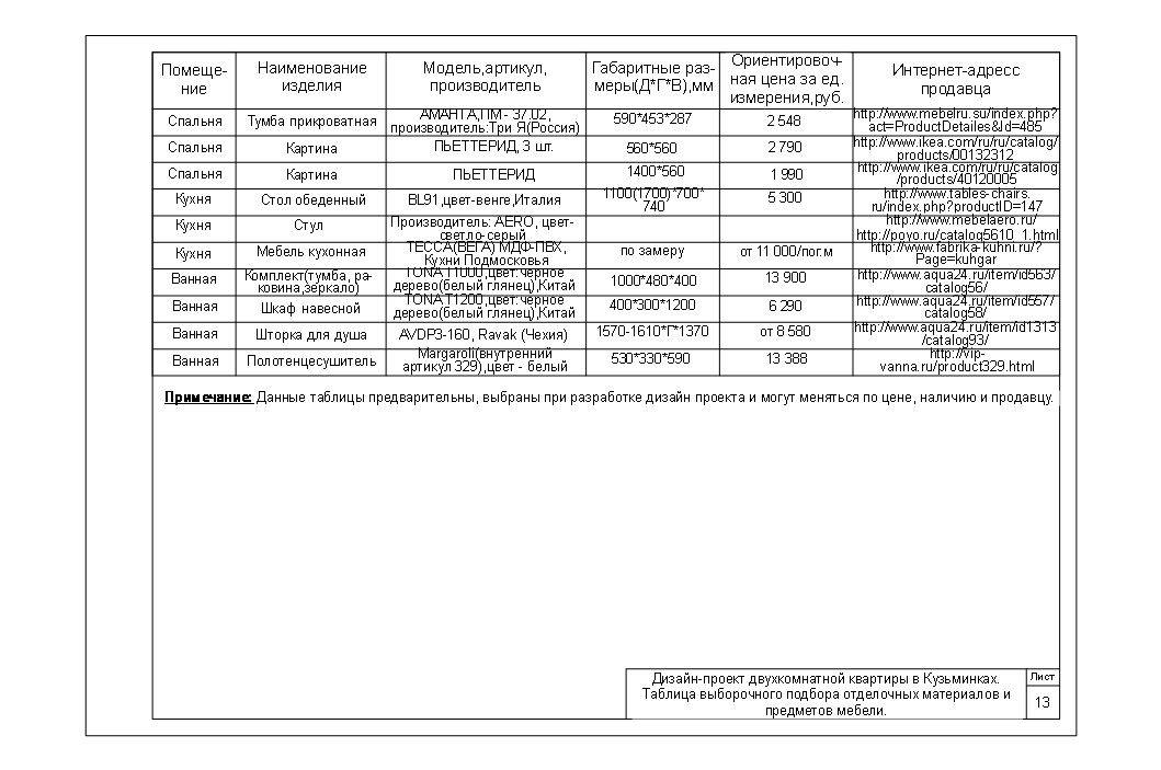 ТАБЛИЦА ВЫБОРОЧНОГО ПОДБОРА ОТДЕЛОЧНЫХ МАТЕРИАЛОВ И ПРЕДМЕТОВ МЕБЕЛИ