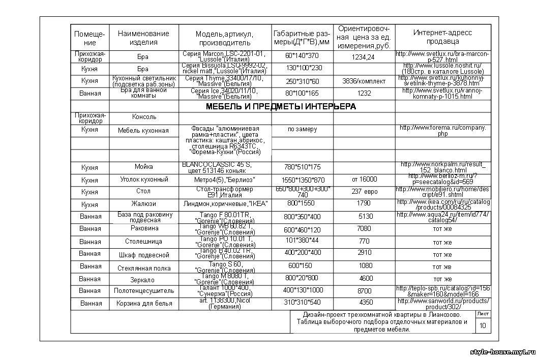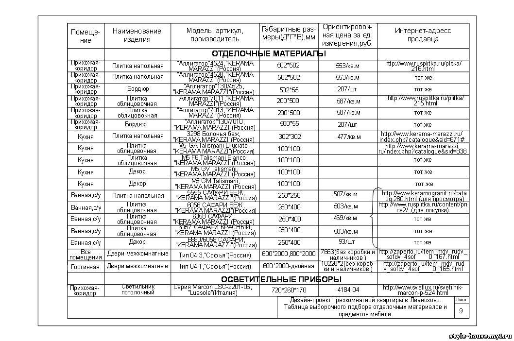 ТАБЛИЦА ВЫБОРОЧНОГО ПОДБОРА ОТДЕЛОЧНЫХ МАТЕРИАЛОВ,